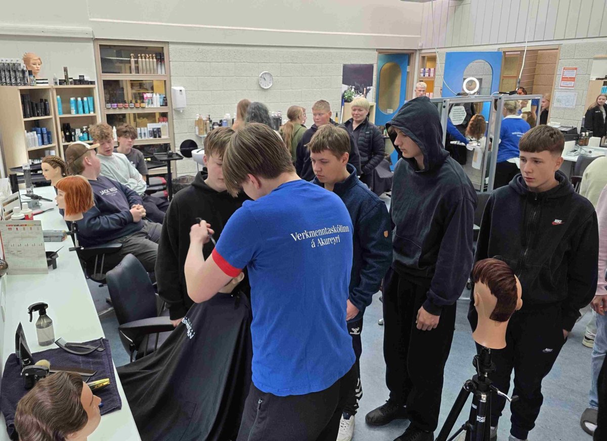Grunnskólanemar kynntu sér bæði verk- og bóknám í VMA. Hér er nemendahópur að fá innsýn í hársnyrtiiðn.