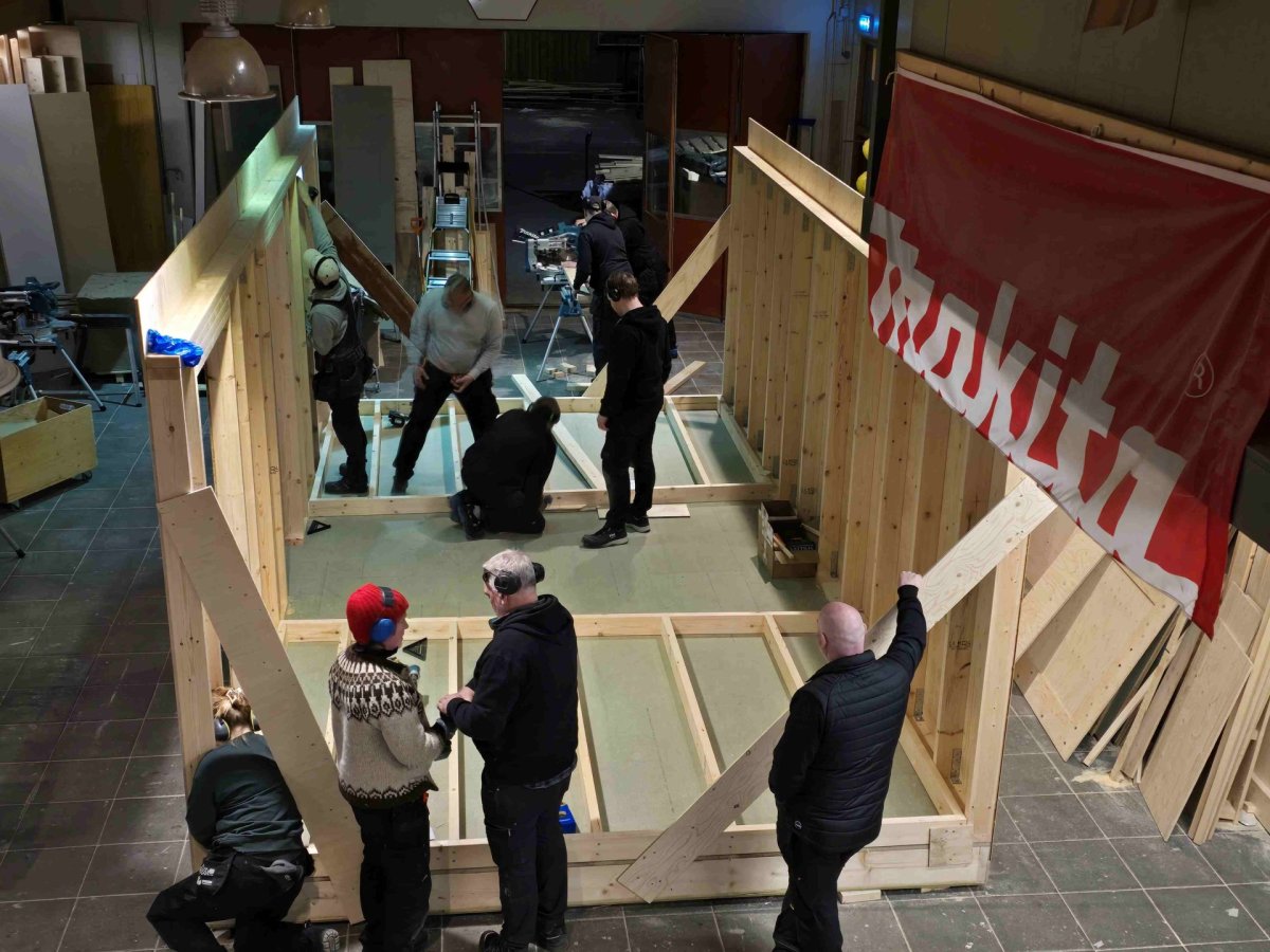 Þegar litið var inn í verklegan tíma kvöldskólanema hjá Kristjáni Erni Helgasyni kennara voru þeir önnum kafnir við smíði þjónustuhússins. Gólfið er farið að taka á sig mynd og búið er að reisa langhliðarveggina. Hlutirnir gerast hratt þegar allir leggjast á eitt.