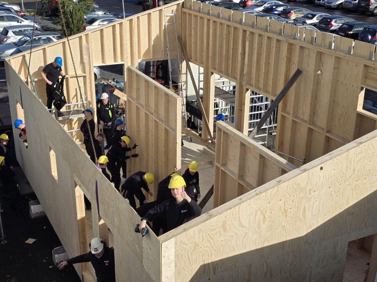 Það er árviss viðburður á fyrstu vikum skólaársins að nemendur á öðru ári í húsasmíði og kennarar þeirra reisi útveggi að frístundahúsi sem nemendur spreyta sig síðan á að byggja núna á haustönn og á vorönn 2025. Að þessu var komið í gær og eftir því sem næst verður komist hefur þetta aldrei gerst áður strax í þriðju kennsluviku. Hreiðar Hreiðarsson byggingarmeistari hjá B.Hreiðarssyni mætti á svæðið með kranabíl og hífði forsmíðaðar gólf- og veggeiningar, sem nemendur hafa verið að smíða síðustu daga, á sinn stað. Eru Hreiðari færðar bestu þakkir fyrir sína vinnu.