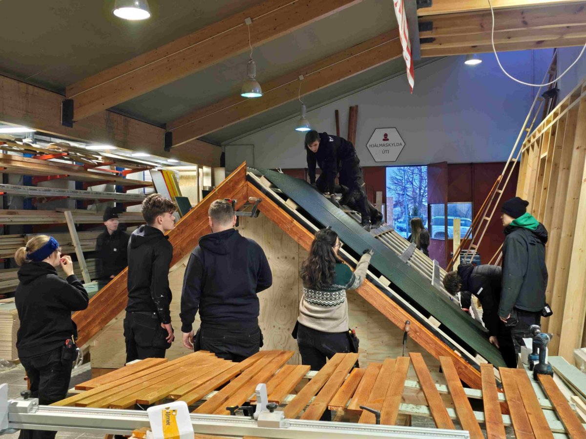 Bygging frístundahúsanna er mikilvægur þáttur í námi húsasmíðanema á öðru ári enda er komið inn á fjölmargt sem gott er að verðandi húsasmiðir hafi góða innsýn í varðandi byggingu timburhúsa. Eftir að tvö af húsunum voru reist utanhúss í september sl. hefur verið unnið að því að loka þeim og klæða þau. Sú vinna er langt komin. En einnig hefur verið unnið inni í húsunum og þar koma líka við sögu nemendur í pípulögnum og um raflagnir sjá nemendur í rafiðn.