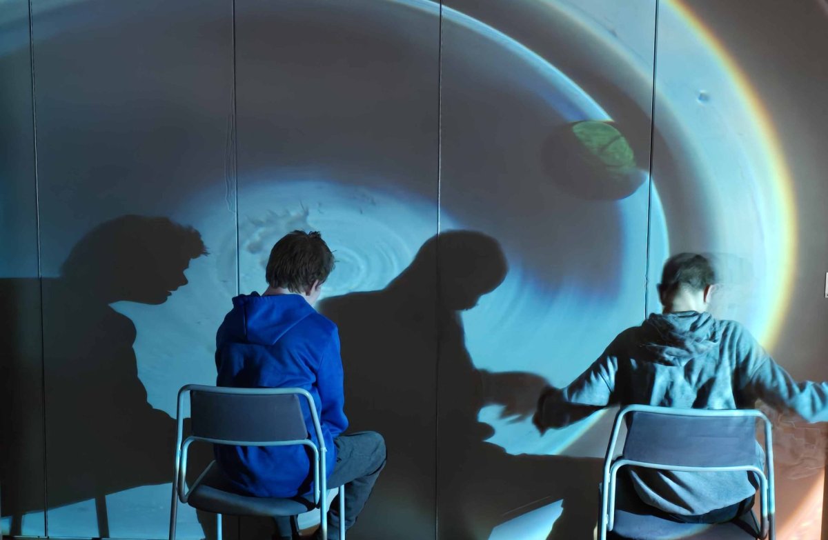 Arna G. Valsdóttir, kennari við listnáms- og hönnunarbraut, hefur í gegnum árin kennt marga og ólíka áfanga með nemendum á sérnámsbraut skólans, ein eða með öðrum kennurum, og árangurinn hefur ávallt verið eftirtektarverður. Á þessari önn kennir Arna nemendum á sérnámsbrautinni og nýtir sér tækni af ýmsum toga til þess að ýta undir áhuga þeirra og athygli. Hér eru Arna og Hulda Júlía Ólafsdóttir iðjuþjálfi að vinna með tveimur nemendum á sérnámsbraut og nýta bæði myndvarparpa og skjávarpa til að skapa hreyfingu sem umlykur nemendurna. Þannig verða þeir, ef svo má segja, hluti af verkinu og upplifuninni. Til þess að ýta frekar undir upplifunina var spiluð seiðandi tónlist. Afar áhugavert var að sjá hversu sterklega þetta einfalda en áhrifamikla myndmál ljósbrota og skugga höfðaði til nemendanna.