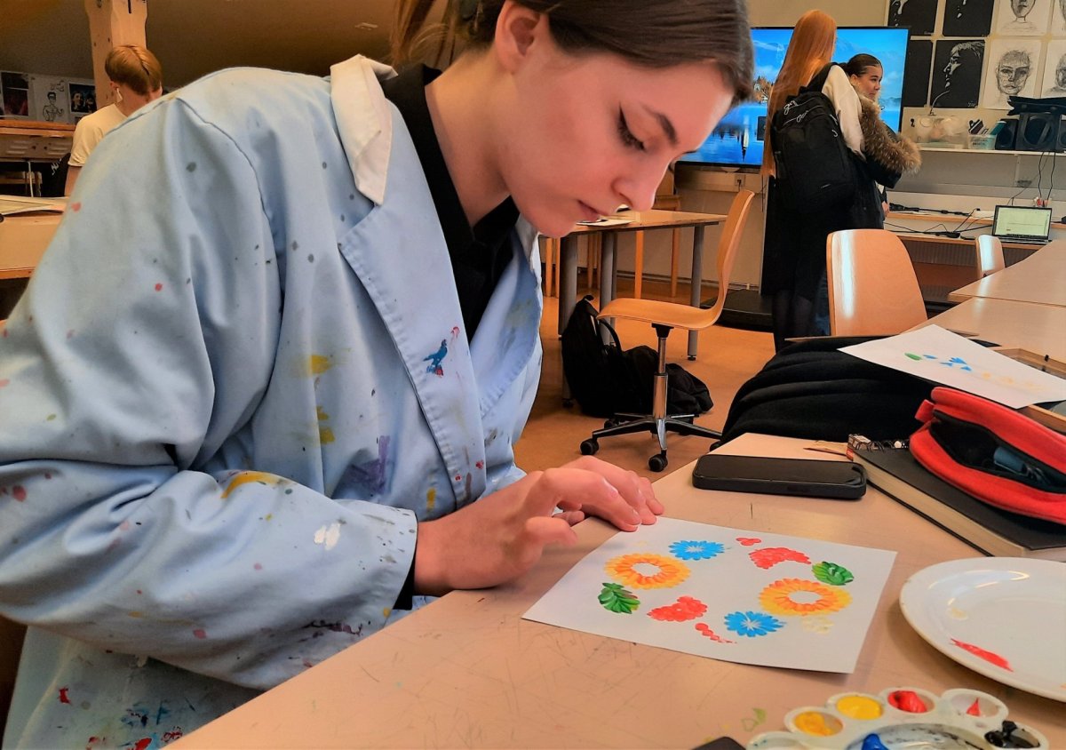 Núna á vorönn er Ioanna m.a. í myndlistaráfanga hjá Hallgrími Ingólfssyni á listnáms- og hönnunarbraut VMA og þar hefur hún m.a. málað Petrykivka myndir. Raunar hefur hún gert það frá barnsaldri. Hér eru t.d. myndir sem Ioanna málaði þegar hún var sjö ára gömul og hér eru dæmi um nýlega unnar Petrykivka myndir Ioönnu.