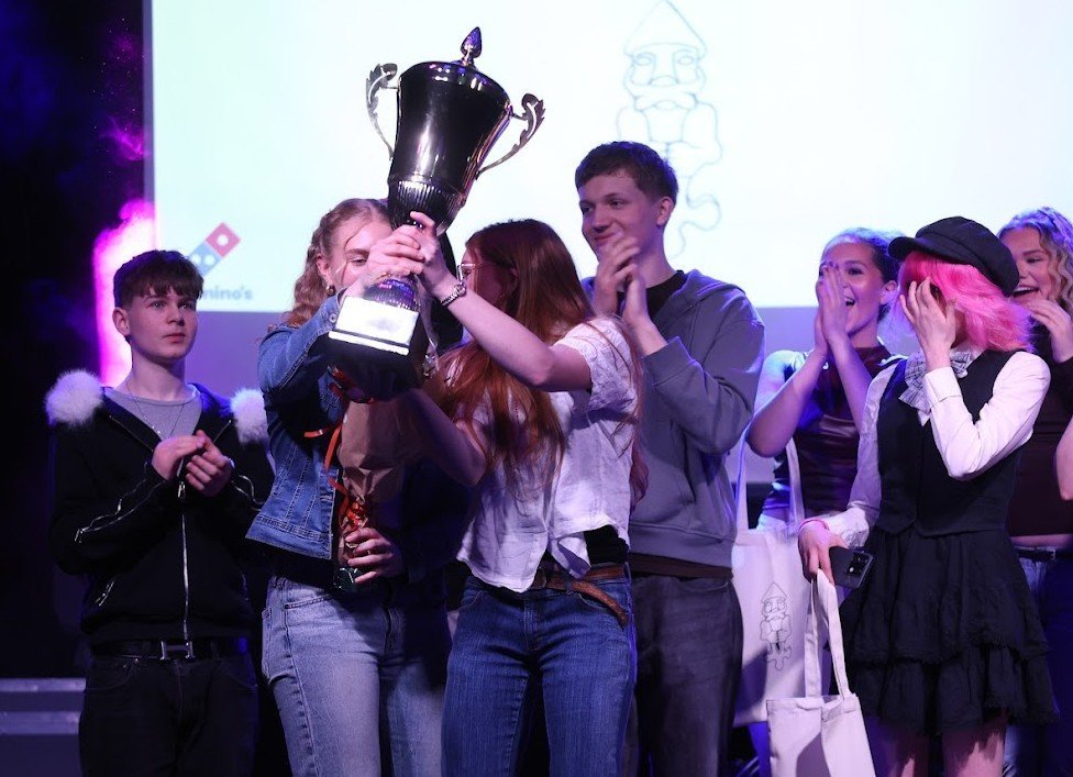 Anna Lovísa og Emilía Björt, sigurvegarar í Sturtuhausnum, söngkeppni VMA, hampa sigurlaununum í Sjallanum í gærkvöld.