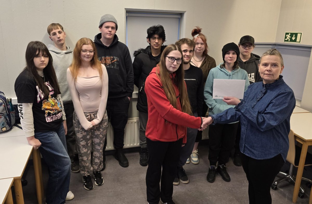 Á dögunum veitti Kristbjörg Álfhildar Sigurðardóttir, fulltrúi Velferðarsjóðs, hundrað þúsund krónunum viðtöku og þakkaði nemendum fyrir frábært framtak og auðsýndan hlýhug og stuðning sem þeir sýndu sjóðnum og öllu því fólki sem þarf á stuðningi hans að halda.