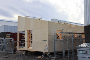 Eftir að hafa forsmíðað gólf og útveggi sumarbústaðarins var komið að því sl. fimmtudag að nemendur á þriðju önn í húsasmíði og kennarar þeirra festu einingarnar saman – með hjálp kranabíls. Það er alltaf mikilvægur áfangi þegar kemur að því að reisa húsið og sjá árangur forsmíðinnar birtast í húsi – eða hluta þess.